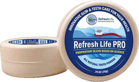 It’s a patent pending blend of Nature’s PreBiotics and Flavenoids. Imagine your health being influenced by something as simple as your daily brushing habits. In 2012, I started having my patients use an early version and found it eliminated gingival bleeding, improved breath, and most important it substantially eliminated the Bad Bacteria of the mouth, including Pg. We’ve taken the vast amount of research (especially for Alzheimer’s and Cardiovascular Disease) and have formulated the proprietary blend of Refresh Life Pro*. Ingredients are selected for their ability to break up the dental plaque biofilm, lower Pg’s virulent factors, help eliminate Pg, and act as prebiotics and nurture the beneficial bacteria of the mouth.